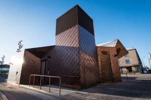 Seinäjoen keskustorin Toripaviljongin näyttävä kuparijulkisivuverhous. Kohteen arkkitehtisuunnittelu: Oopeaa Arkkitehdit.
